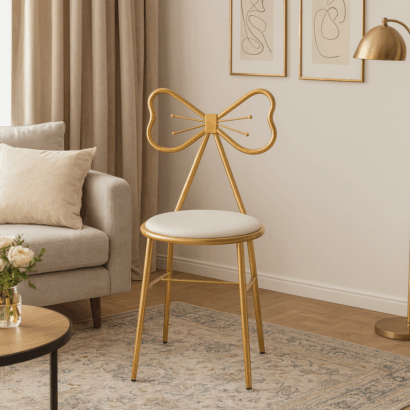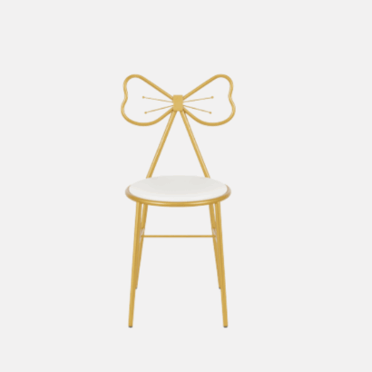 Dale un toque sofisticado a tu espacio con la Silla Bow, una pieza única que combina estilo minimalista con un acabado glamuroso. Su respaldo en forma de lazo dorado aporta un aire delicado y original, convirtiéndola en el complemento ideal para dormitorios, tocadores, cafeterías o salas modernas.